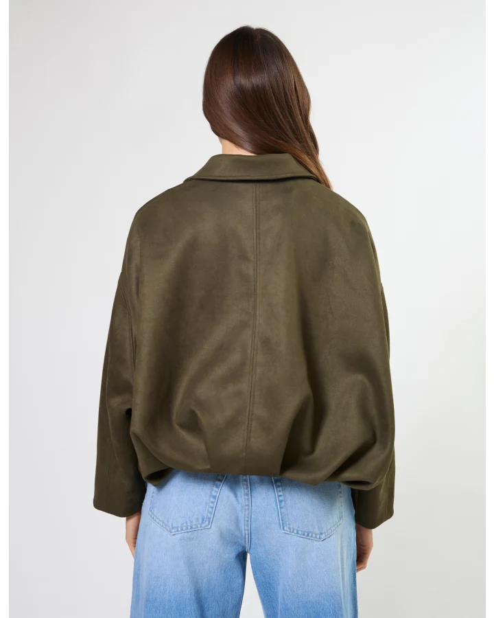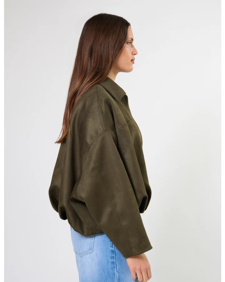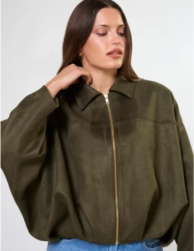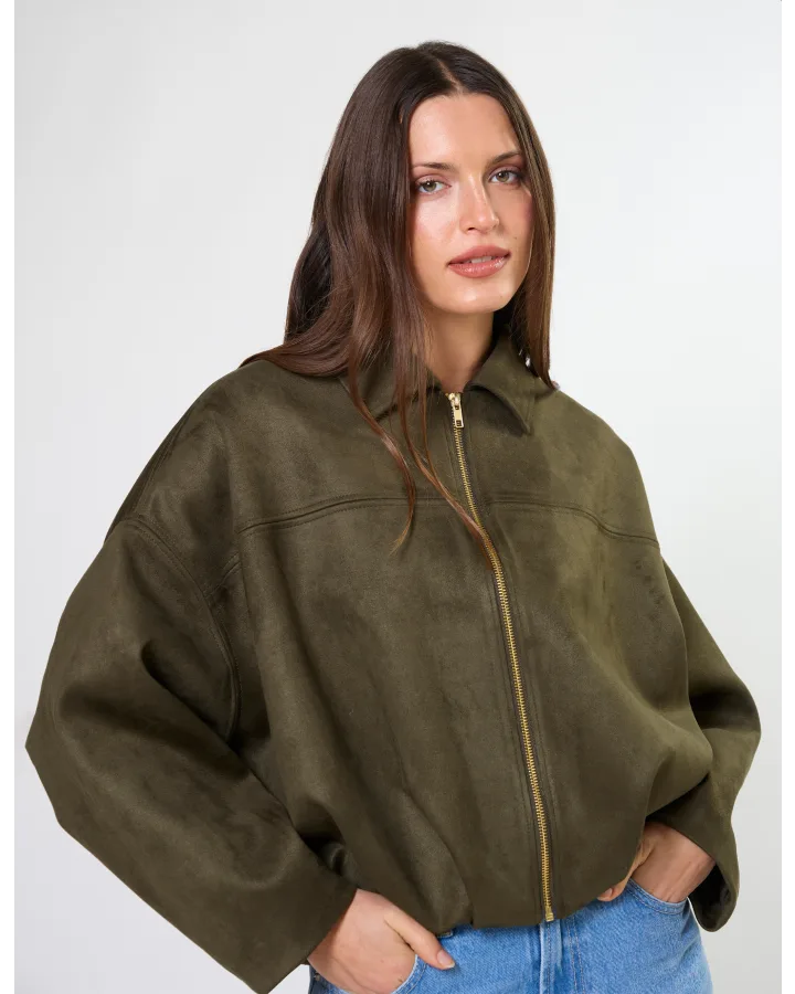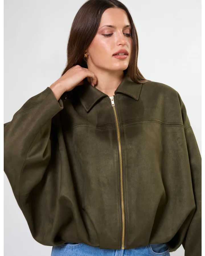 Mock suede relaxed batwing jacket with contrast gold zip front fastening. Fully lined.