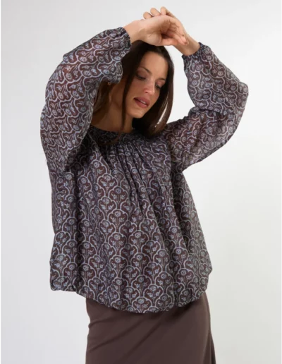 Crew neck blouse with full raglan sleeves gathered into cuffs. The hemline is turned under into a bubble hem and lined bodice.